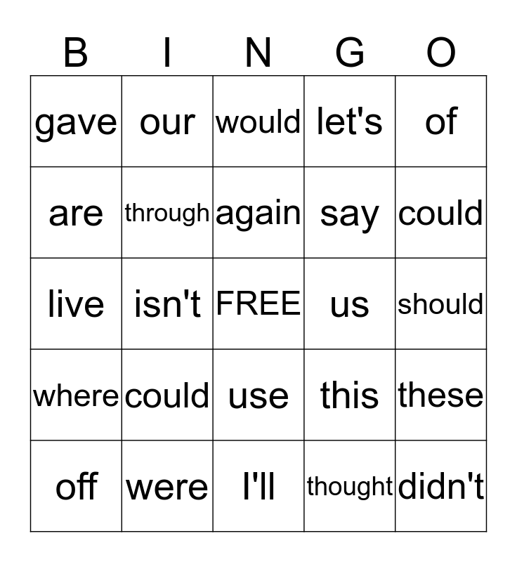 This bingo card has a free space and 24 words: could, were, again, off, of, gave, are, our, us, use, say, live, this, these, through, thought, should, would, could, isn't, didn't, where, let's and I'll.