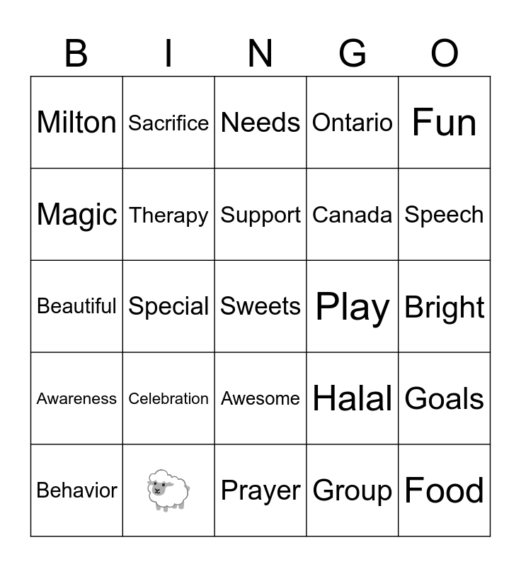 This bingo card has 50 words: Eid, Sweets, Family, Prayer, Celebration, Mosque, Sacrifice, Hope, Magic, Strength, Therapy, Ontario, Goals, Halal, Skills, Games, Support, Play, Summer, Fun, Special, Group, Milton, Canada, Party, Food, Speech, Help, Needs, Awesome, Brave, Unique, ☀️, ⭐, 🐑, 🌻, 🌙, ❤️, 🐮, Bright, Smile, Happy, Sad, Strong, Behavior, Beautiful, Perfect, Gift, Awareness and Kind.
