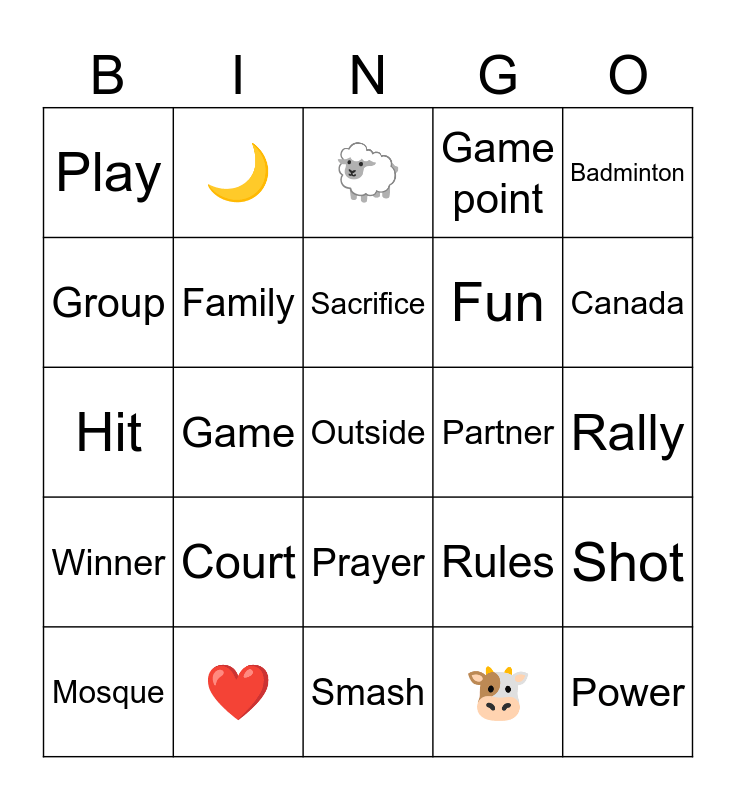 This bingo card has 39 words: Eid Party, Celebration, Sweets, Family, Mosque, Prayer, Sacrifice, Halal, Badminton, Winner, Game, Game point, Outside, Rally, Partner, Court, Birdie, Play, Serve, Rules, Group, Smash, Fun, Canada, Milton, Star, Power, 🏸, 👟, 🌙, ⭐, Energy, 🐑, ❤️, 🐮, 🌻, Shot, Hit and Strong.