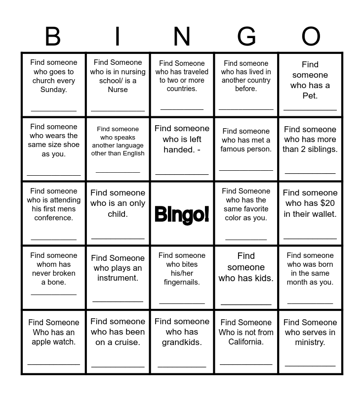 This bingo card has a free space and 24 words: Find Someone Who has an apple watch. ____________, Find Someone who plays an instrument. ___________, Find someone who is left handed. - ___________, Find Someone Who is not from California. ____________, Find someone who has a Pet. ___________, Find someone who goes to church every Sunday. ___________, Find Someone who is in nursing school/ is a Nurse _____________, Find Someone who has traveled to two or more countries. ___________, Find Someone who has the same favorite color as you. __________, Find someone who has $20 in their wallet. ___________, Find someone who is attending his first mens conference. ___________, Find someone who speaks another language other than English ____________, Find someone who has kids. __________, Find someone who was born in the same month as you. ___________, Find someone who wears the same size shoe as you. _____________, Find someone who has been on a cruise. ___________, Find someone who has grandkids. __________, Find someone who has lived in another country before. ______________, Find someone who has more than 2 siblings. ___________, Find someone whom has never broken a bone. ___________, Find someone who is an only child. ___________, Find someone who bites his/her fingernails. ___________, Find someone who has met a famous person. _____________ and Find Someone who serves in ministry. ___________.