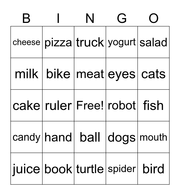 This bingo card has a free space and 30 words: book, pencil, ruler, eraser, cheese, truck, bike, ball, robot, turtle, fish, bird, spider, snake, cats, mouse, dogs, candy, hand, salad, cake, feet, pizza, eyes, milk, yogurt, mouth, juice, meat and ice cream.