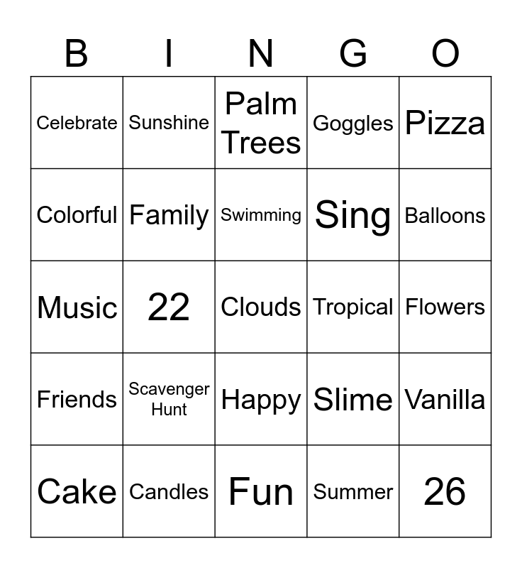 This bingo card has 33 words: 26, 10, 22, Harley, Friends, Family, Pizza, Cake, Sunshine, Rain, Swimming, Palm Trees, Flamingos, Surf Boards, Tropical, Balloons, Candles, Music, Scavenger Hunt, Slime, Happy, Birthday, Celebrate, Flowers, Fun, Clouds, Goggles, Sing, Colorful, Vanilla, Rainbow, Summer and Hot.