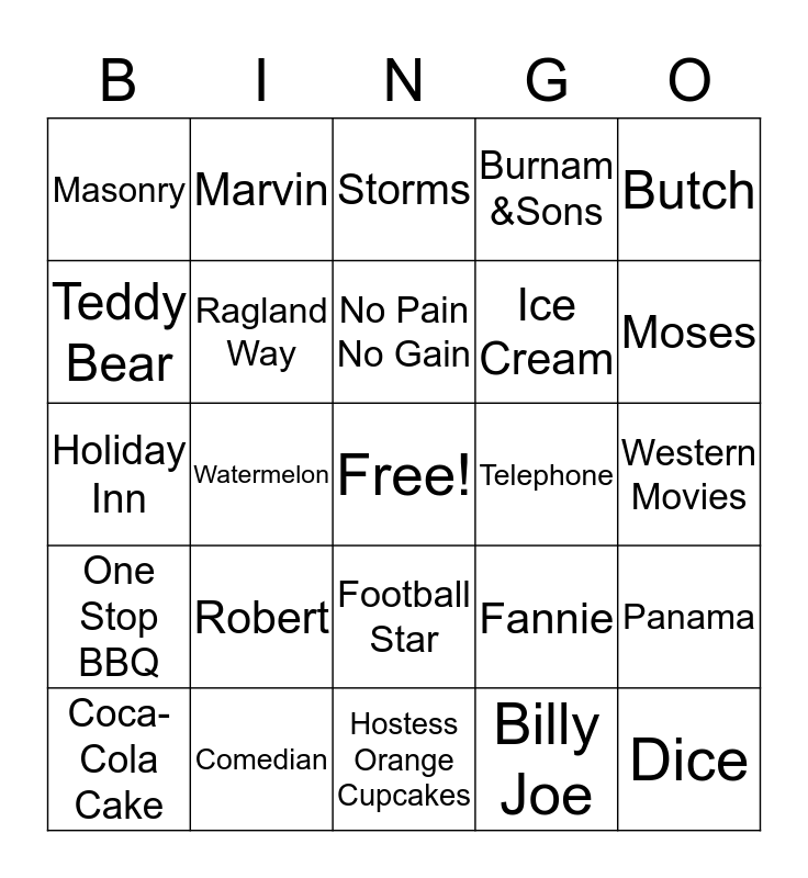 This bingo card has a free space and 24 words: Robert, Comedian, No Pain No Gain, Coca-Cola Cake, Butch, Masonry, Teddy Bear, Marvin, Telephone, Football Star, Ice Cream, Holiday Inn, Fannie, Panama, Ragland Way, Billy Joe, Western Movies, Storms, Moses, Watermelon, Dice, One Stop BBQ, Burnam &Sons and Hostess Orange Cupcakes.