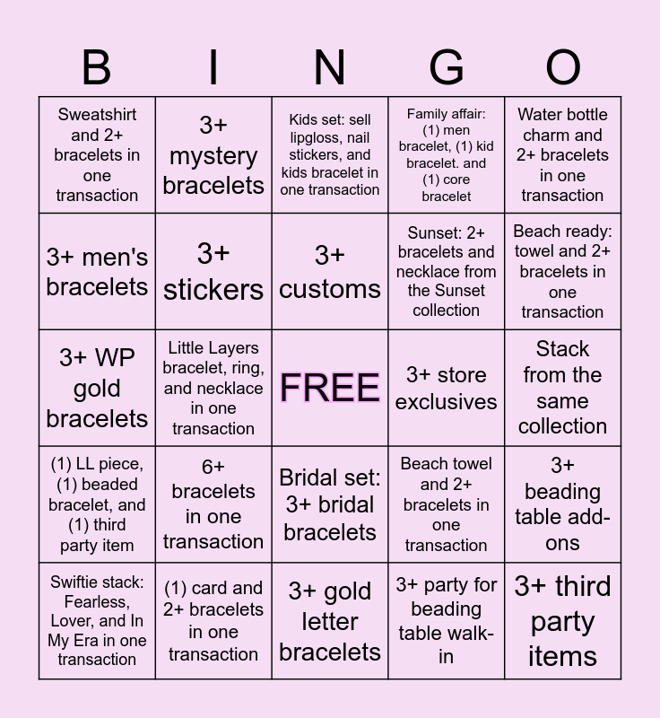 This bingo card has a free space and 24 words: 6+ bracelets in one transaction, (1) card and 2+ bracelets in one transaction, 3+ customs, Swiftie stack: Fearless, Lover, and In My Era in one transaction, Water bottle charm and 2+ bracelets in one transaction, Sweatshirt and 2+ bracelets in one transaction, 3+ men's bracelets, 3+ mystery bracelets, 3+ store exclusives, Bridal set: 3+ bridal bracelets, Sunset: 2+ bracelets and necklace from the Sunset collection, 3+ WP gold bracelets, Beach towel and 2+ bracelets in one transaction, 3+ beading table add-ons, 3+ stickers, 3+ party for beading table walk-in, Stack from the same collection, Kids set: sell lipgloss, nail stickers, and kids bracelet in one transaction, Beach ready: towel and 2+ bracelets in one transaction, Little Layers bracelet, ring, and necklace in one transaction, 3+ third party items, (1) LL piece, (1) beaded bracelet, and (1) third party item, Family affair: (1) men bracelet, (1) kid bracelet. and (1) core bracelet and 3+ gold letter bracelets.