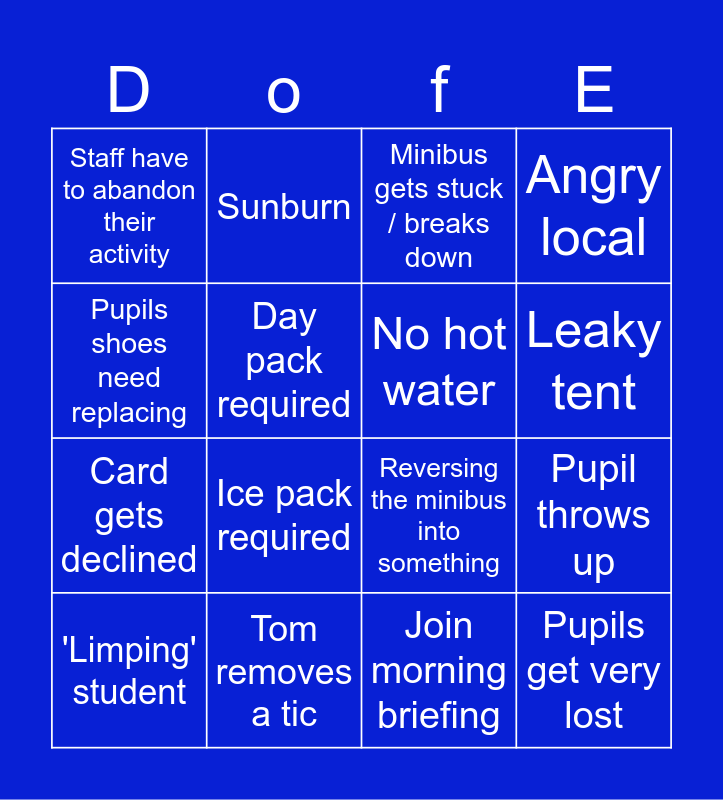 This bingo card has 20 words: Pupil throws up, Toilet roll runs out, Minibus gets stuck / breaks down, Water fight, 'Limping' student, Pupils shoes need replacing, Tom removes a tic, Staff have to abandon their activity, Card gets declined, Sunburn, Ice pack required, Reversing the minibus into something, Day pack required, Pupils get very lost, No hot water, Campsite cat, Leaky tent, Angry local, Join morning briefing and Found a geocache.