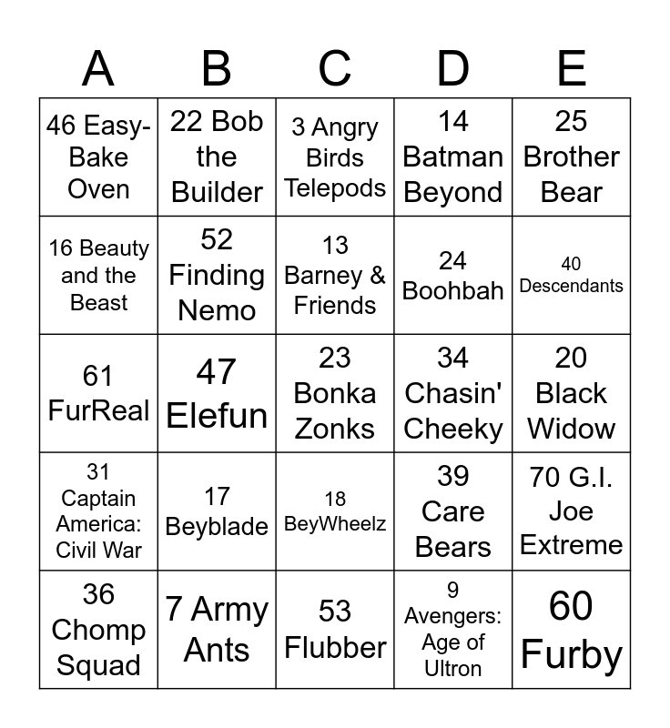 This bingo card has 79 words: 1 Air Raiders, 2 Aladdin, 3 Angry Birds Telepods, 4 Ant-Man, 5 Ant-Man and the Wasp, 6 Apex Legends, 7 Army Ants, 8 The Avengers, 9 Avengers: Age of Ultron, 10 Avengers: Infinity War, 11 Avengers: Endgame, 12 Baby Alive, 13 Barney & Friends, 14 Batman Beyond, 15 Battle Beasts, 16 Beauty and the Beast, 17 Beyblade, 18 BeyWheelz, 19 Black Panther, 20 Black Widow, 21 Blythe, 22 Bob the Builder, 23 Bonka Zonks, 24 Boohbah, 25 Brother Bear, 26 Built to Rule, 27 Bull's-Eye Ball2, 28 Cabbage Patch Kids (1989–1994), 29 Captain America: The First Avenger, 30 Captain America: The Winter Soldier, 31 Captain America: Civil War, 32 Centurions, 33 Charmkins, 34 Chasin' Cheeky, 35 Chicken Little, 36 Chomp Squad, 37 C.O.P.S. 'n Crooks, 38 CribLife, 39 Care Bears, 40 Descendants, 41 Descendants 2, 42 Descendants 3, 43 Disney Princess (2016–2022), 44 Death Row Records, 45 Dolly Darling dolls (1965-1968), 46 Easy-Bake Oven, 47 Elefun, 48 Elena of Avalor, 49 Fantastic Four, 50 Fantastic Four: Rise of the Silver Surfer, 51 The Falcon and the Winter Soldier, 52 Finding Nemo, 53 Flubber, 54 Fortnite (2019–present), 55 Freaktown, 56 Frozen (2016–2022), 57 Olaf's Frozen Adventure, 58 Frozen 2, 59 Funny Mooners, 60 Furby, 61 FurReal, 62 Gator Golf, 63 Ghostbusters (Started in 2020), 64 Ghostbusters: Afterlife, 65 G.I. Joe, 66 G.I. Joe: America's Movable Fighting Man, 67 G.I. Joe Adventure Team, 68 G.I. Joe: A Real American Hero, 69 Action Force (European brand of A Real American Hero), 70 G.I. Joe Extreme, 71 G.I. Joe: Resolute, 72 G.I. Joe vs. Cobra, 73 G.I. Joe: Sigma 6, 74 G.I. Joe: The Rise of Cobra, 75 G.I. Joe: Retaliation, 76 Giraffalaff limbo, 77 Glo Worm, 78 Gobots and 79 Gotta Dance Girls.