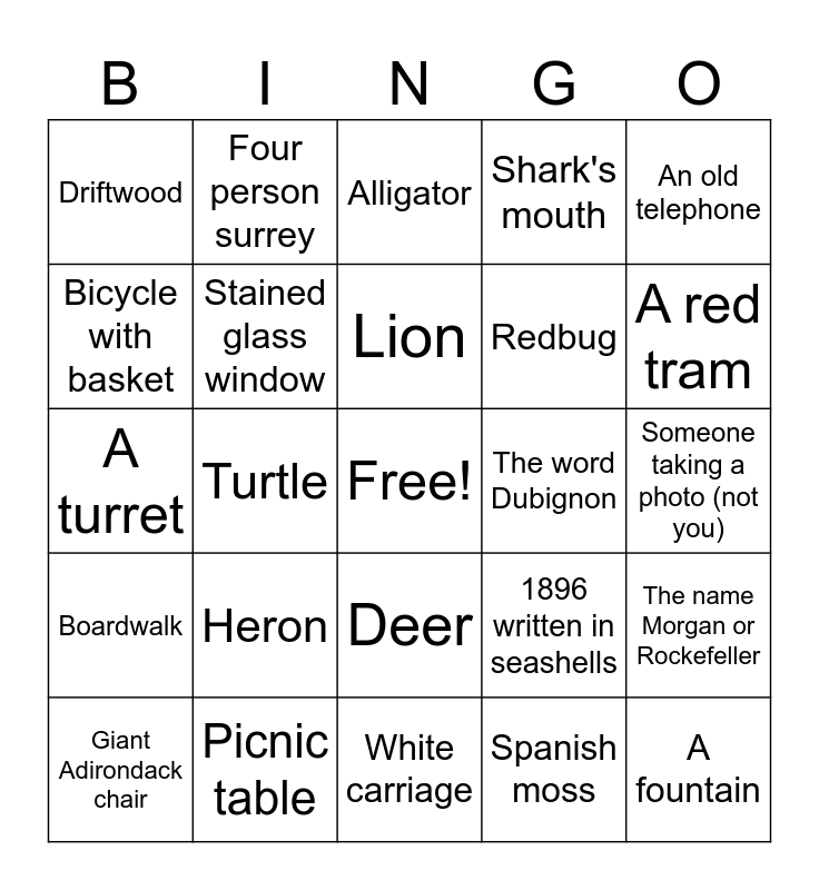This bingo card has a free space and 24 words: Heron, Picnic table, Lion, Giant Adirondack chair, An old telephone, Driftwood, Bicycle with basket, Four person surrey, The word Dubignon, Deer, Redbug, A turret, 1896 written in seashells, The name Morgan or Rockefeller, Stained glass window, Spanish moss, Someone taking a photo (not you), Alligator, A red tram, Turtle, A fountain, Boardwalk, Shark's mouth and White carriage.
