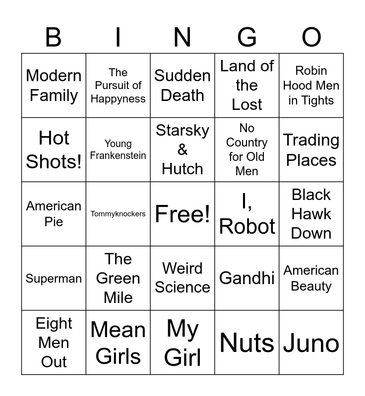 This bingo card has a free space and 64 words: A Perfect Murder, T2, Training Day, American Beauty, She's All That, Who Framed Roger Rabbit, The Pursuit of Happyness, Bedazzled, Starsky & Hutch, SNL, Weird Science, Pearl Harbor, Black Hawk Down, Robin Hood Men in Tights, Suicide Squad, Hot Shots!, Tommyknockers, Modern Family, Gidget, No Country for Old Men, The Green Mile, Superman, Land of the Lost, Taxi, Tron: Legacy, The Transporter, The Founder, Miss Congeniality, Showgirls, Cujo, Prometheus, Daredevil, Timecop, Goldfinger, Trading Places, Eight Men Out, Shrek, Nuts, Platoon, Young Frankenstein, American Pie, I, Robot, Jay & Silent Bob Strike Back, The Patriot, I Am Sam, Juno, Mean Girls, She's All That, Gandhi, Yours, Mine, and Ours, Stephen Colbert & Special Guest, Moonraker, My Girl, The Maltese Falcon, Stripes, A View to a Kill, Sudden Death, Baby Mama, Napoleon Dynamite, You Only Live Twice, Twins, Shane, Blade Runner and The Deer Hunter.