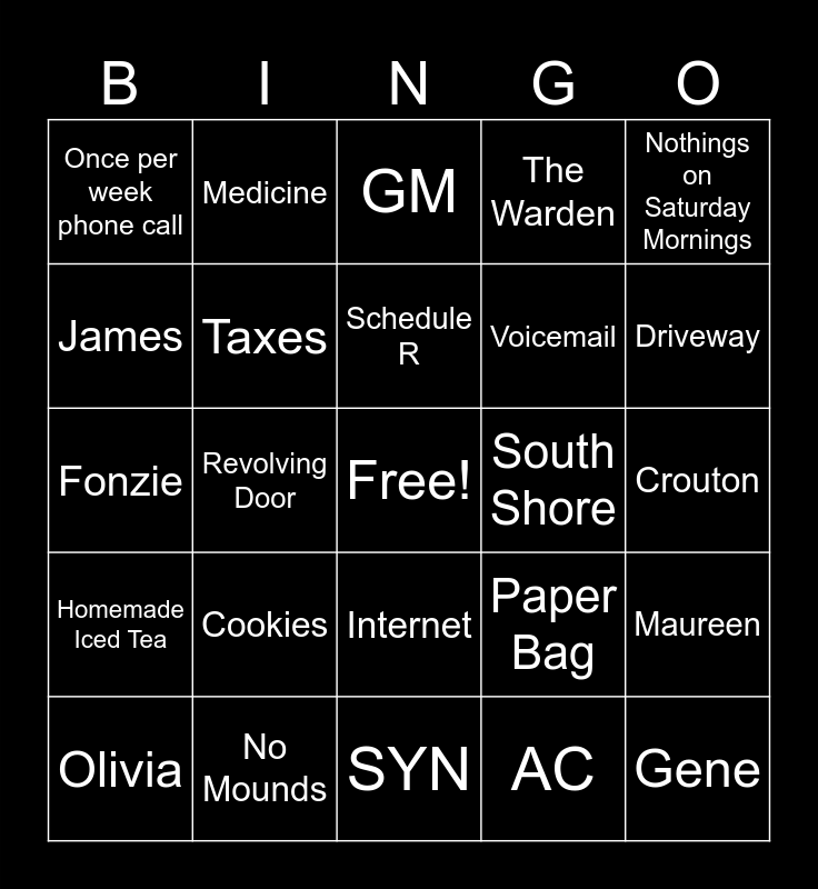 This bingo card has a free space and 80 words: Crosswords, VA, GM, Laundry, Favorite Grandson, Wheel of Fortune, Jeopardy, Horizon, I got your bag of candy, Millie, Racism, Netflick, The Warden, Once per week phone call, Youtube, James, Patrice, Cookies, Snapple, Crouton, Any of Bills Friends, Nothings on Saturday Mornings, Fonzie, Schedule R, Taxes, Moms GF, Shoprite, That used to be a song, Bus, Powerball, Driveway, Stair Chair, SYN, Married With Children, Olivia, South Shore, Commack, Amityville, Canned Food, Gene, Low Toilet, Yogi, Gunsmoke, Western Channel, Needles, Medicine, Coffee, Rite Aid, Logo Channel, MASH, Maureen, Revolving Door, Paper Bag, Top Grandpa, Rangers, Mets, MOD, Soup, Bank, Internet, Voicemail, Morning Phone Call, Alexa, Rain, Pool, Saturday Morning, Michelle, Lifeguard, Any Absurdly Low Cost, Wrong Locations, Homemade Iced Tea, No Mounds, Prom, Regents, Roundbottom Bob, Wrong Directions, AC, City, 76 and The Laugh.