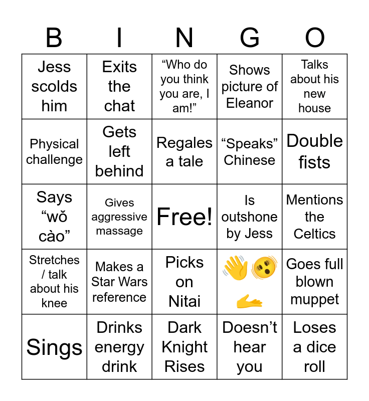 This bingo card has a free space and 24 words: Makes a Star Wars reference, Drinks energy drink, Regales a tale, Sings, Talks about his new house, Jess scolds him, Physical challenge, Exits the chat, Is outshone by Jess, Picks on Nitai, “Speaks” Chinese, Says “wǒ cào”, 👋🫨🫴, Goes full blown muppet, Gets left behind, Doesn’t hear you, Mentions the Celtics, “Who do you think you are, I am!”, Double fists, Gives aggressive massage, Loses a dice roll, Stretches / talk about his knee, Shows picture of Eleanor and Dark Knight Rises.