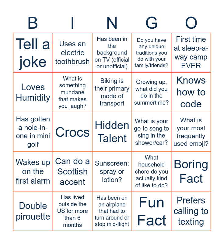 This bingo card has a free space and 24 words: Can do a Scottish accent, Has lived outside the US for more than 6 months, Biking is their primary mode of transport, Double pirouette, First time at sleep-a-way camp EVER, Tell a joke, Loves Humidity, Uses an electric toothbrush, What is your go-to song to sing in the shower/car?, Sunscreen: spray or lotion?, Growing up, what did you do in the summertime?, Has gotten a hole-in-one in mini golf, What household chore do you actually kind of like to do?, Boring Fact, What is something mundane that makes you laugh?, Fun Fact, What is your most frequently used emoji?, Has been in the background on TV (official or unofficial), Knows how to code, Crocs, Prefers calling to texting, Wakes up on the first alarm, Do you have any unique traditions you do with your family/friends? and Has been on an airplane that had to turn around or stop mid-flight.