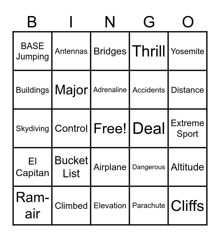 This bingo card has a free space and 26 words: Airplane, Parachute, Adrenaline, Climbed, Yosemite, BASE Jumping, Buildings, Antennas, Extreme Sport, Dangerous, Accidents, Skydiving, Altitude, Ram-air, Control, Custom, Thrill, El Capitan, Bridges, Cliffs, Distance, Elevation, Deal, Bucket List, Major and Attempts.