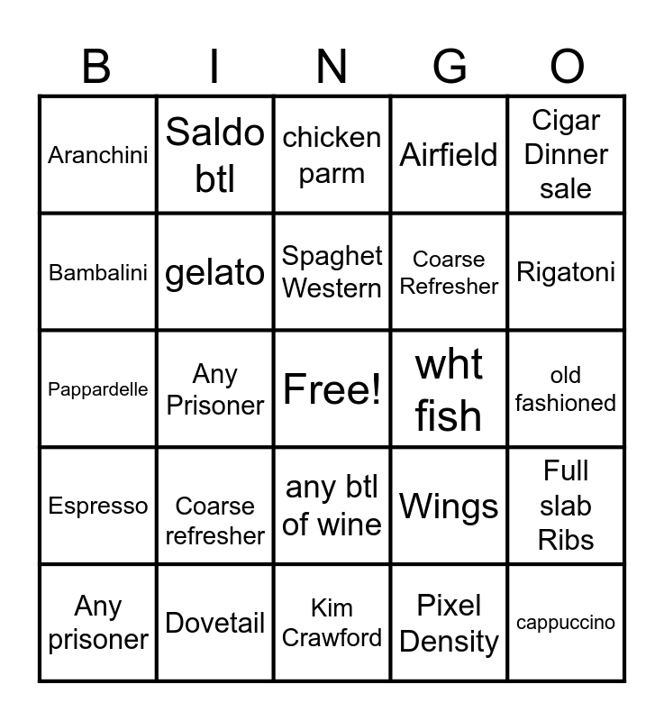 This bingo card has a free space and 24 words: Any prisoner, Coarse refresher, Spaghet Western, Pixel Density, Cigar Dinner sale, Aranchini, Saldo btl, chicken parm, wht fish, old fashioned, Pappardelle, gelato, Wings, Full slab Ribs, Bambalini, Dovetail, Kim Crawford, Airfield, Rigatoni, Espresso, Any Prisoner, any btl of wine, Coarse Refresher and cappuccino.
