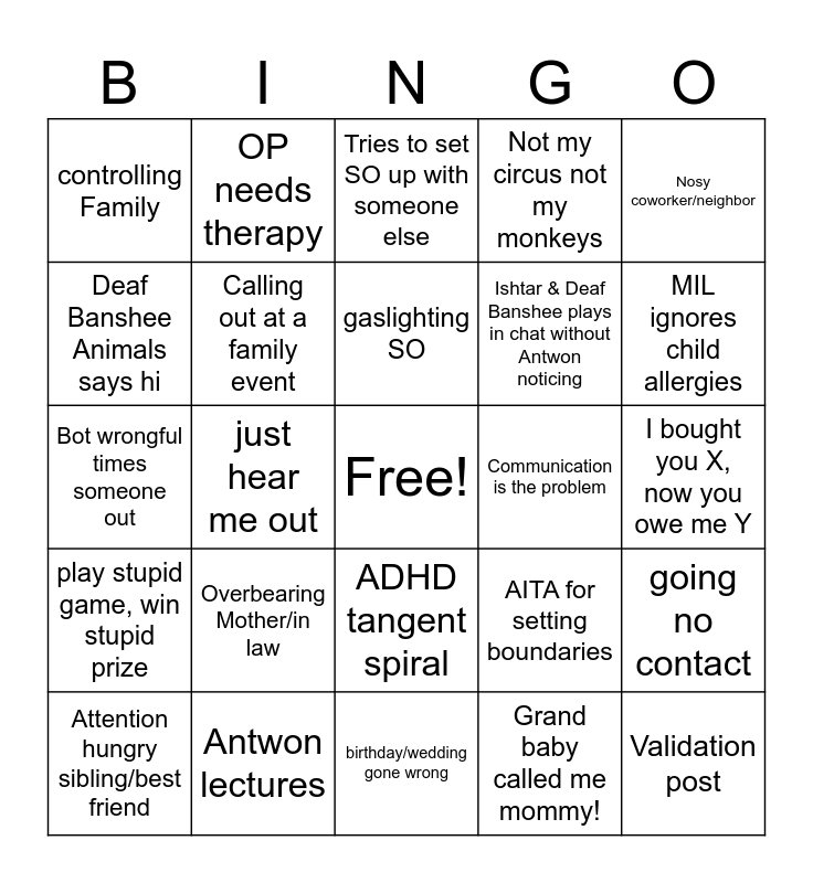 This bingo card has a free space and 24 words: Overbearing Mother/in law, Antwon lectures, gaslighting SO, Attention hungry sibling/best friend, Nosy coworker/neighbor, controlling Family, Deaf Banshee Animals says hi, OP needs therapy, Communication is the problem, ADHD tangent spiral, Ishtar & Deaf Banshee plays in chat without Antwon noticing, Bot wrongful times someone out, AITA for setting boundaries, going no contact, Calling out at a family event, Grand baby called me mommy!, I bought you X, now you owe me Y, Tries to set SO up with someone else, MIL ignores child allergies, just hear me out, Validation post, play stupid game, win stupid prize, Not my circus not my monkeys and birthday/wedding gone wrong.