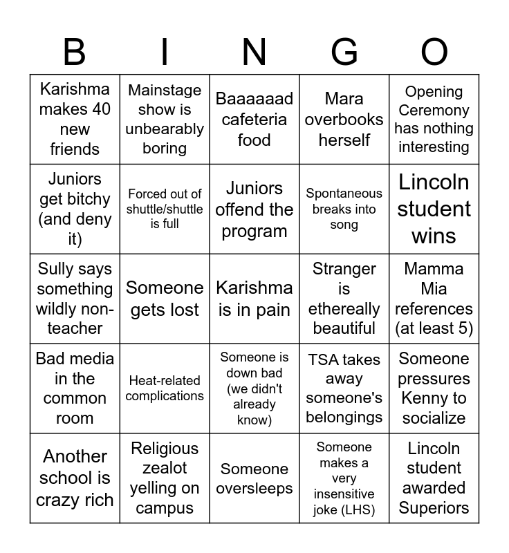 This bingo card has a free space and 24 words: Heat-related complications, Religious zealot yelling on campus, Juniors offend the program, Another school is crazy rich, Opening Ceremony has nothing interesting, Karishma makes 40 new friends, Juniors get bitchy (and deny it), Mainstage show is unbearably boring, Stranger is ethereally beautiful, Someone is down bad (we didn't already know), Spontaneous breaks into song, Sully says something wildly non-teacher, TSA takes away someone's belongings, Someone pressures Kenny to socialize, Forced out of shuttle/shuttle is full, Someone makes a very insensitive joke (LHS), Mamma Mia references (at least 5), Baaaaaad cafeteria food, Lincoln student wins, Someone gets lost, Lincoln student awarded Superiors, Bad media in the common room, Mara overbooks herself and Someone oversleeps.