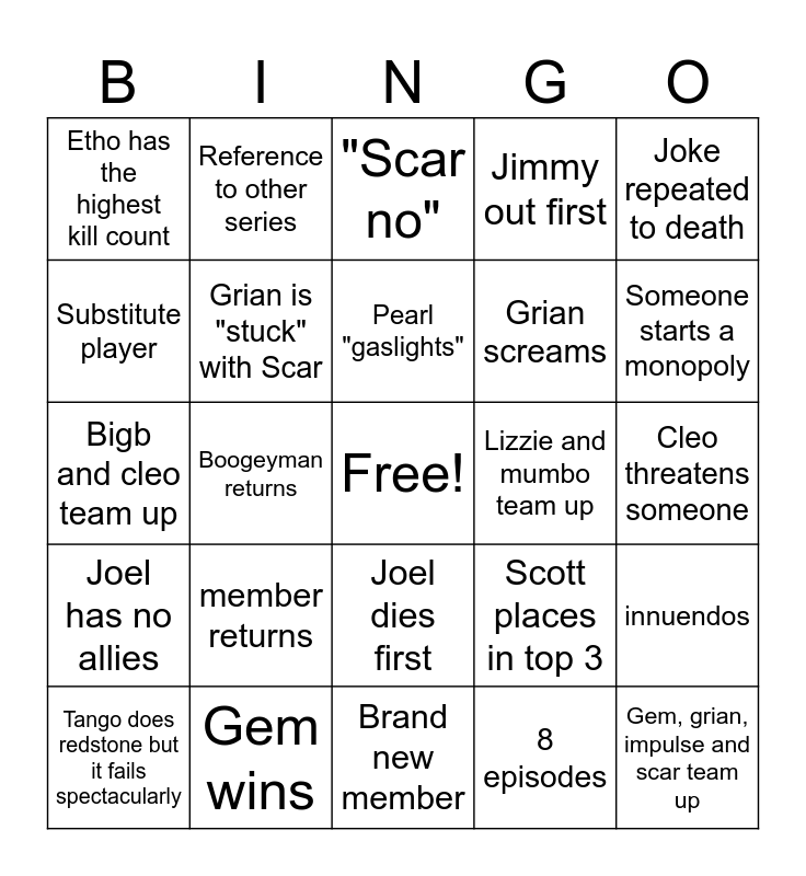 This bingo card has a free space and 24 words: member returns, Gem wins, Pearl "gaslights", Tango does redstone but it fails spectacularly, Joke repeated to death, Etho has the highest kill count, Substitute player, Reference to other series, Lizzie and mumbo team up, Joel dies first, Grian screams, Bigb and cleo team up, Scott places in top 3, innuendos, Grian is "stuck" with Scar, 8 episodes, Cleo threatens someone, "Scar no", Someone starts a monopoly, Boogeyman returns, Gem, grian, impulse and scar team up, Joel has no allies, Jimmy out first and Brand new member.