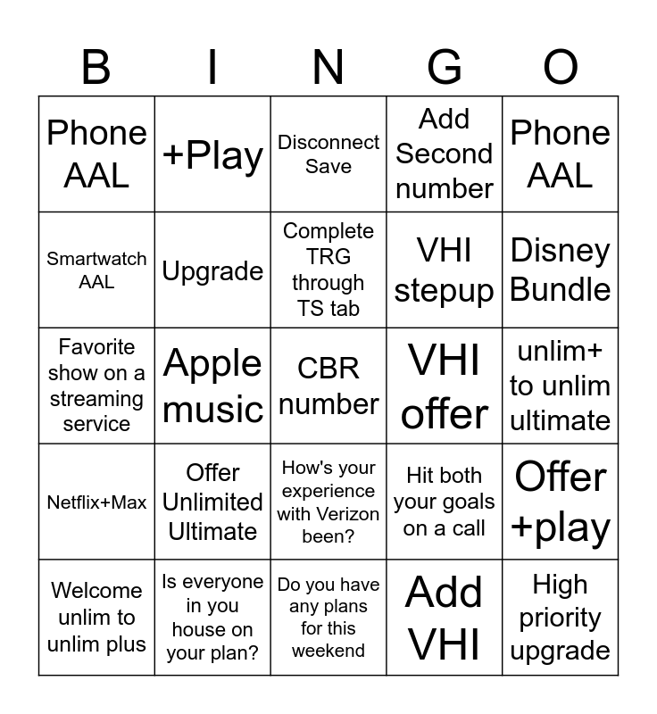 This bingo card has 25 words: Offer Unlimited Ultimate, Do you have any plans for this weekend, Complete TRG through TS tab, Welcome unlim to unlim plus, Phone AAL, Phone AAL, Smartwatch AAL, +Play, VHI offer, How's your experience with Verizon been?, VHI stepup, Favorite show on a streaming service, Hit both your goals on a call, Offer +play, Upgrade, High priority upgrade, unlim+ to unlim ultimate, Disconnect Save, Disney Bundle, Apple music, CBR number, Is everyone in you house on your plan?, Netflix+Max, Add Second number and Add VHI.