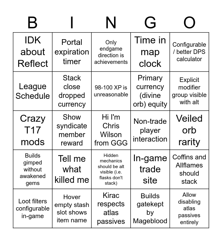 This bingo card has a free space and 24 words: Tell me what killed me, Hover empty stash slot shows item name, 98-100 XP is unreasonable, Loot filters configurable in-game, Configurable / better DPS calculator, IDK about Reflect, League Schedule, Portal expiration timer, Non-trade player interaction, Hidden mechanics should be alt visible (i.e. flasks don't stack), Primary currency (divine orb) equity, Crazy T17 mods, In-game trade site, Coffins and Allflames should stack, Stack close dropped currency, Builds gatekept by Mageblood, Veiled orb rarity, Only endgame direction is achievements, Explicit modifier group visible with alt, Show syndicate member reward, Allow disabling atlas passives entirely, Builds gimped without awakened gems, Time in map clock and Kirac respects atlas passives.
