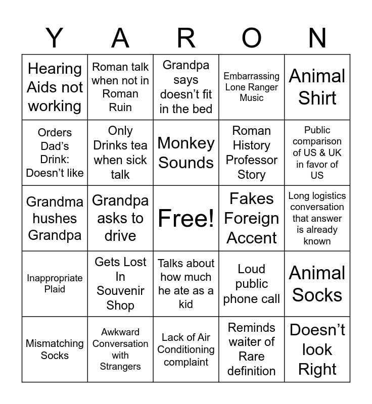 This bingo card has a free space and 24 words: Gets Lost In Souvenir Shop, Awkward Conversation with Strangers, Monkey Sounds, Mismatching Socks, Animal Shirt, Hearing Aids not working, Orders Dad’s Drink: Doesn’t like, Roman talk when not in Roman Ruin, Fakes Foreign Accent, Talks about how much he ate as a kid, Roman History Professor Story, Grandma hushes Grandpa, Loud public phone call, Animal Socks, Only Drinks tea when sick talk, Reminds waiter of Rare definition, Long logistics conversation that answer is already known, Grandpa says doesn’t fit in the bed, Public comparison of US & UK in favor of US, Grandpa asks to drive, Doesn’t look Right, Inappropriate Plaid, Embarrassing Lone Ranger Music and Lack of Air Conditioning complaint.