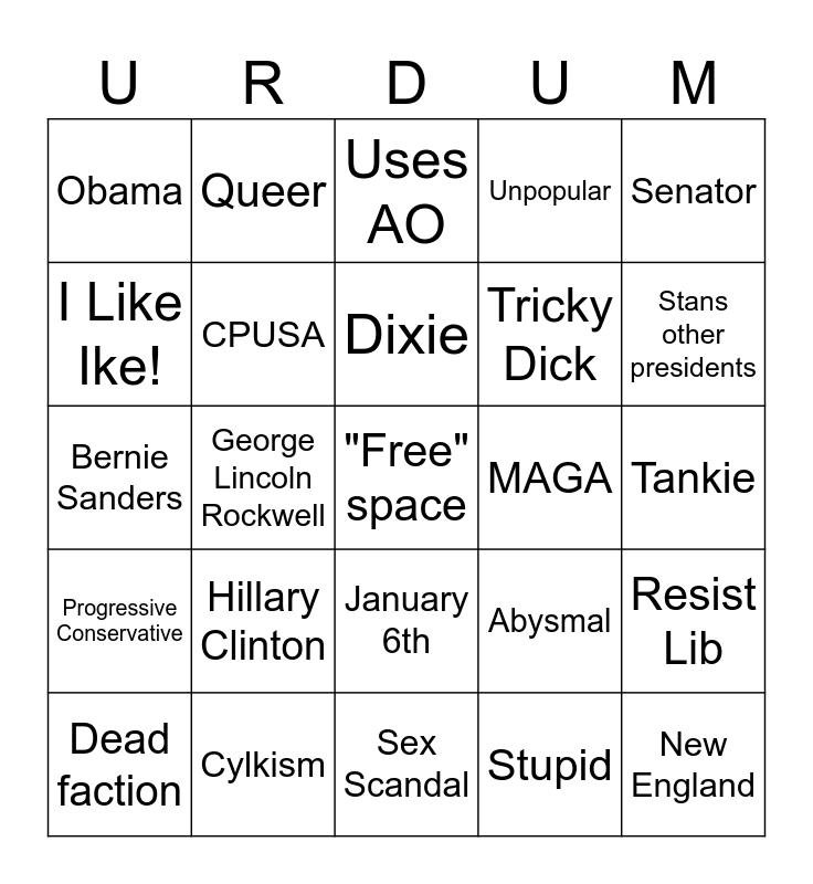 This bingo card has a free space and 39 words: LBJ, George Wallace, Joe Biden, CPUSA, Dead faction, January 6th, Dixie, Major bill, Senator, Progressive Conservative, George Lincoln Rockwell, Unpopular, New England, Tankie, MAGA, Hillary Clinton, Houe Rep., Obama, Rockies, Abysmal, I Like Ike!, Sex Scandal, Tricky Dick, Stans other presidents, Almost won the presidency, Karl Marx, War criminal, Civil War, Corrupt, Queer, Spiro Agnew, Assassinated, Uses AO, Cylkism, Stupid, Angry, Resist Lib, Bernie Sanders and Revolutionary.