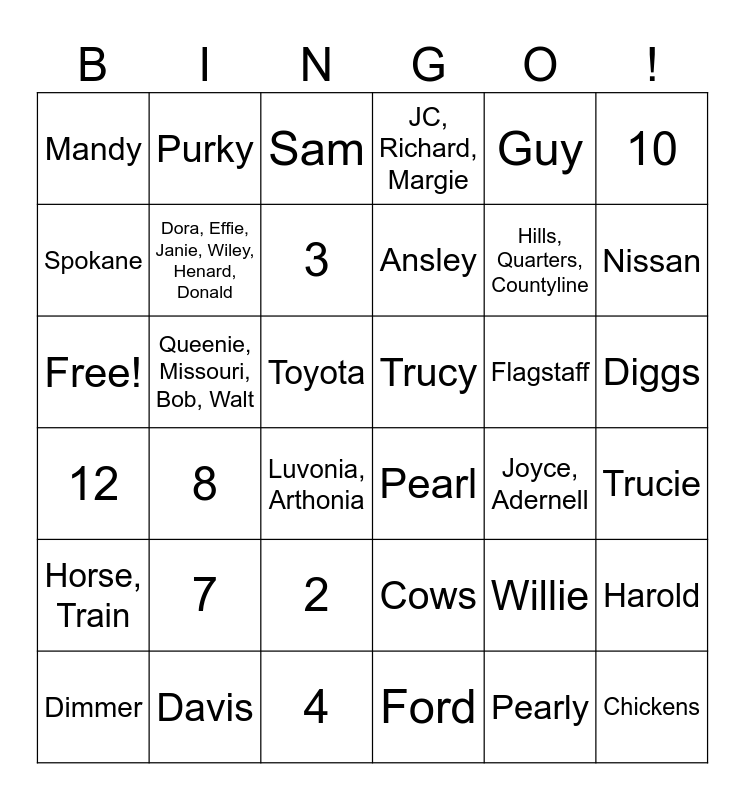 This bingo card has 36 words: 12, 8, 4, Ansley, Flagstaff, Diggs, Mandy, Davis, Sam, Cows, Hills, Quarters, Countyline, 10, Horse, Train, Queenie, Missouri, Bob, Walt, 3, JC, Richard, Margie, Willie, Trucie, Spokane, Dora, Effie, Janie, Wiley, Henard, Donald, Luvonia, Arthonia, Pearl, Joyce, Adernell, Harold, Free!, Purky, Toyota, Ford, Guy, Nissan, Dimmer, 7, 2, Trucy, Pearly and Chickens.