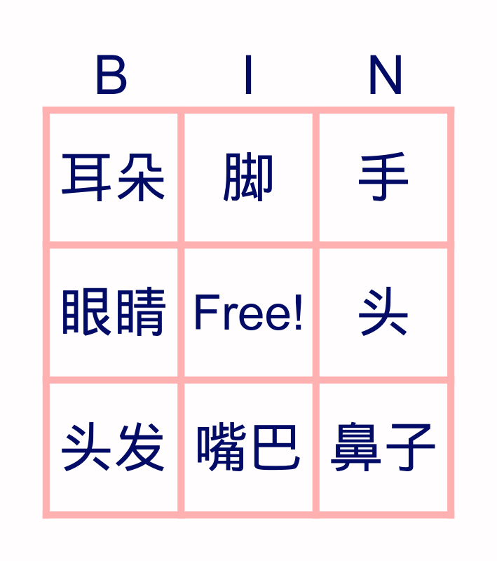 This bingo card has a free space and 8 words: 头, 手, 脚, 头发, 耳朵, 鼻子, 眼睛 and 嘴巴.