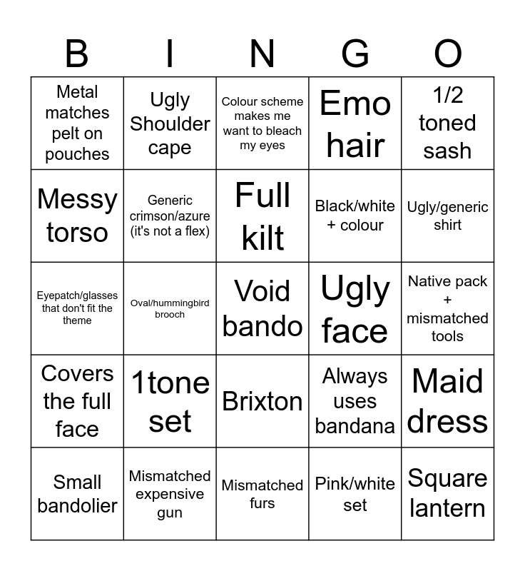 This bingo card has 25 words: 1tone set, Mismatched furs, Full kilt, Small bandolier, 1/2 toned sash, Metal matches pelt on pouches, Messy torso, Ugly Shoulder cape, Ugly face, Brixton, Black/white + colour, Eyepatch/glasses that don't fit the theme, Always uses bandana, Maid dress, Generic crimson/azure (it's not a flex), Square lantern, Native pack + mismatched tools, Colour scheme makes me want to bleach my eyes, Ugly/generic shirt, Oval/hummingbird brooch, Void bando, Mismatched expensive gun, Covers the full face, Emo hair and Pink/white set.