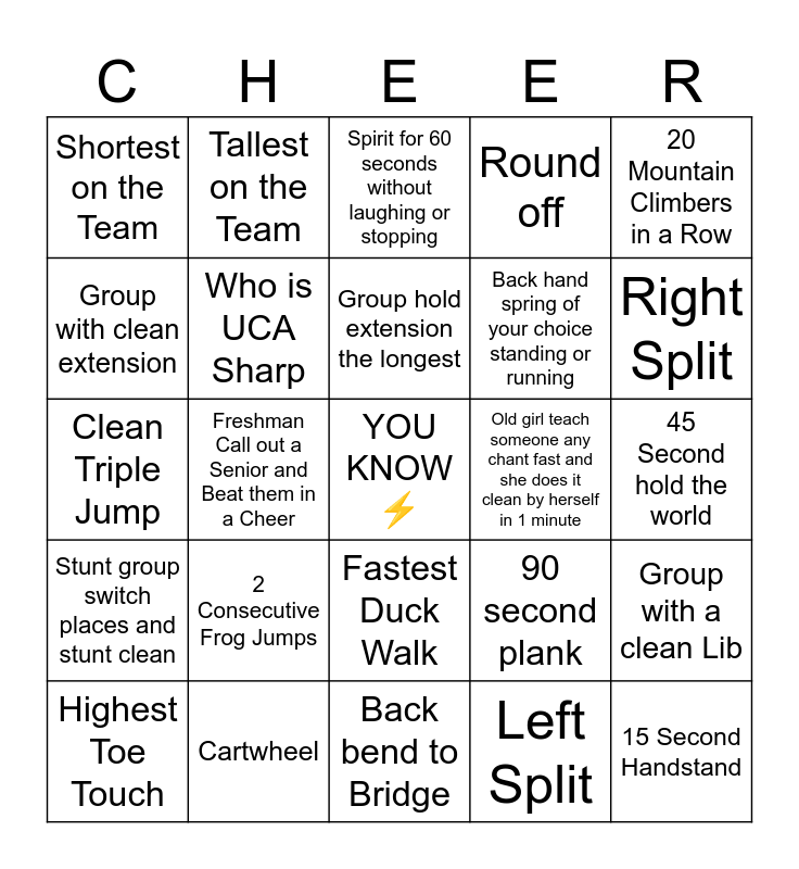 This bingo card has a free space and 24 words: 2 Consecutive Frog Jumps, Cartwheel, Group hold extension the longest, Highest Toe Touch, 20 Mountain Climbers in a Row, Shortest on the Team, Group with clean extension, Tallest on the Team, Old girl teach someone any chant fast and she does it clean by herself in 1 minute, Fastest Duck Walk, Back hand spring of your choice standing or running, Clean Triple Jump, 90 second plank, Group with a clean Lib, Who is UCA Sharp, Left Split, 45 Second hold the world, Spirit for 60 seconds without laughing or stopping, Right Split, Freshman Call out a Senior and Beat them in a Cheer, 15 Second Handstand, Stunt group switch places and stunt clean, Round off and Back bend to Bridge.