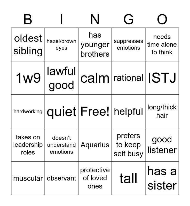 This bingo card has a free space and 24 words: doesn’t understand emotions, observant, calm, muscular, needs time alone to think, oldest sibling, 1w9, hazel/brown eyes, helpful, Aquarius, rational, hardworking, prefers to keep self busy, good listener, lawful good, tall, long/thick hair, has younger brothers, ISTJ, quiet, has a sister, takes on leadership roles, suppresses emotions and protective of loved ones.