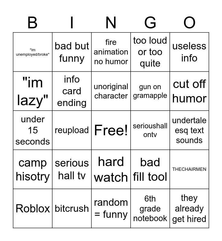 This bingo card has a free space and 59 words: one ear, bitcrush, resume, camp hisotry, 6th grade notebook, furry, info card ending, multiple medias, gun on gramapple, tie = serious, too loud or too quite, "not joke submission", "im lazy", smash walls, tiktok ai voice, "im unemployed/broke", they already get hired, useless info, google doc, unoriginal character, serioushall ontv, fire animation no humor, Roblox, THECHAIRMEN, stickman, discolored gramapple, "are you serious?", no interview, cut off humor, copyright free song, 1 image comic, forgor name, talking to camrea, no voices, bad but funny, use audio from gramapple video, PowerPoint, reupload, yellow area, under 15 seconds, cartoon theme intro, serious hall tv, undertale esq text sounds, unedited png, 3d, bad greenscreen, bad pacing, rushed entry even tho you had time, hard watch, random = funny, can count the pixels, unrelated meme, (something) reference, no swear filter, thread, bad fill tool, bad assest, lackluster/void background and paint app.