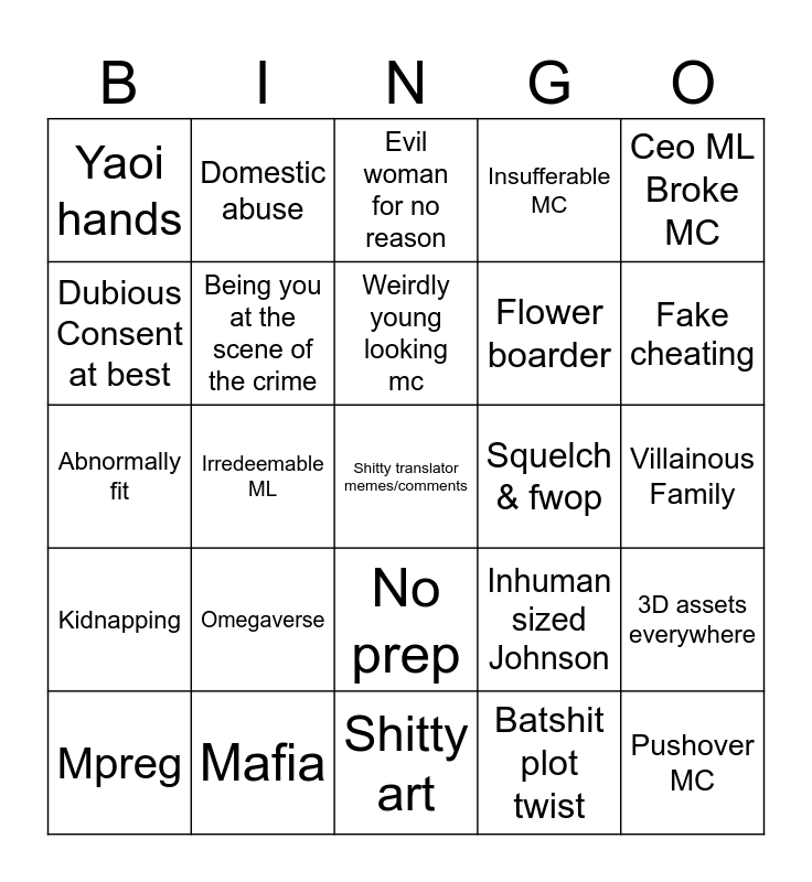 This bingo card has 25 words: Omegaverse, Shitty art, Weirdly young looking mc, Mpreg, Ceo ML Broke MC, Yaoi hands, Dubious Consent at best, Domestic abuse, Squelch & fwop, No prep, Flower boarder, Abnormally fit, Inhuman sized Johnson, 3D assets everywhere, Being you at the scene of the crime, Pushover MC, Villainous Family, Evil woman for no reason, Fake cheating, Irredeemable ML, Shitty translator memes/comments, Mafia, Kidnapping, Insufferable MC and Batshit plot twist.