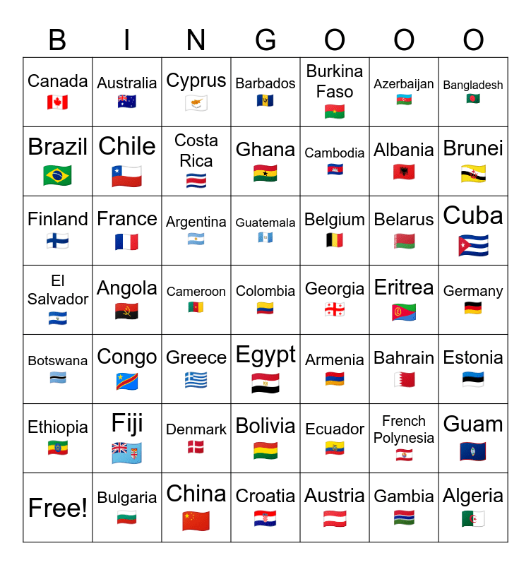 This bingo card has 51 words: Free!, Albania 🇦🇱, Algeria 🇩🇿, Angola 🇦🇴, Argentina 🇦🇷, Armenia 🇦🇲, Australia 🇦🇺, Austria 🇦🇹, Azerbaijan 🇦🇿, Bahrain 🇧🇭, Bangladesh 🇧🇩, Barbados 🇧🇧, Belarus 🇧🇾, Belgium 🇧🇪, Bolivia 🇧🇴, Botswana 🇧🇼, Brazil 🇧🇷, Brunei 🇧🇳, Bulgaria 🇧🇬, Burkina Faso 🇧🇫, Cambodia 🇰🇭, Cameroon 🇨🇲, Canada 🇨🇦, Chile 🇨🇱, China 🇨🇳, Colombia 🇨🇴, Costa Rica 🇨🇷, Croatia 🇭🇷, Cuba 🇨🇺, Cyprus 🇨🇾, Czech Republic 🇨🇿, Congo 🇨🇩, Denmark 🇩🇰, Ecuador 🇪🇨, Egypt 🇪🇬, El Salvador 🇸🇻, Eritrea 🇪🇷, Estonia 🇪🇪, Ethiopia 🇪🇹, Fiji 🇫🇯, Finland 🇫🇮, France 🇫🇷, French Polynesia 🇵🇫, Gambia 🇬🇲, Georgia 🇬🇪, Germany 🇩🇪, Ghana 🇬🇭, Greece 🇬🇷, Guam 🇬🇺, Guatemala 🇬🇹 and Guyana 🇬🇾.