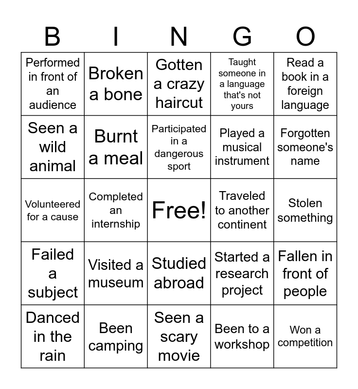 This bingo card has a free space and 24 words: Visited a museum, Been camping, Participated in a dangerous sport, Danced in the rain, Read a book in a foreign language, Performed in front of an audience, Seen a wild animal, Broken a bone, Traveled to another continent, Studied abroad, Played a musical instrument, Volunteered for a cause, Started a research project, Fallen in front of people, Burnt a meal, Been to a workshop, Stolen something, Gotten a crazy haircut, Forgotten someone's name, Completed an internship, Won a competition, Failed a subject, Taught someone in a language that's not yours and Seen a scary movie.