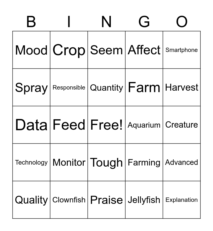 This bingo card has a free space and 30 words: Clownfish, Tank, Feed, Recently, Mood, Seem, Responsible, Tough, Aquarium, Praise, Creature, Explanation, Jellyfish, Sensor, Harvest, Ripe, Farming, Technology, Monitor, Smartphone, Data, Condition, Crop, Farm, Spray, Affect, Advanced, Quality, Quantity and Agriculture.