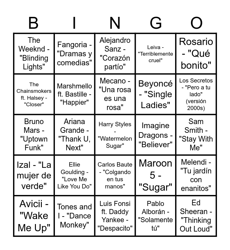 This bingo card has 90 words: Rosalía - "Malamente", Shakira - "Waka Waka", Alejandro Sanz - "Corazón partío", Enrique Iglesias - "Bailando", La Oreja de Van Gogh - "El último vals", David Bisbal - "Ave María", Adele - "Hello", Luis Fonsi ft. Daddy Yankee - "Despacito", Pablo Alborán - "Solamente tú", Ed Sheeran - "Shape of You", Coldplay - "Viva la Vida", Amaral - "Cómo hablar", El Canto del Loco - "Besos", Beyoncé - "Single Ladies", Manu Chao - "Me gustas tú", Bruno Mars - "Uptown Funk", Juanes - "La camisa negra", Lady Gaga - "Bad Romance", Vetusta Morla - "Copenhague", Rihanna ft. Calvin Harris - "We Found Love", Estopa - "La raja de tu falda", Dua Lipa - "New Rules", Mecano - "Una rosa es una rosa", Justin Bieber - "Sorry", Melendi - "Tu jardín con enanitos", Katy Perry - "Firework", Serrat & Sabina - "Y sin embargo", Taylor Swift - "Shake It Off", Héroes del Silencio - "Entre dos tierras", Pharrell Williams - "Happy", Malú - "Aprendiz", Billie Eilish - "Bad Guy", Dani Martín - "Cero", Imagine Dragons - "Believer", Rosario - "Qué bonito", The Weeknd - "Blinding Lights", Fangoria - "Dramas y comedias", Adele - "Rolling in the Deep", Leiva - "Terriblemente cruel", Sam Smith - "Stay With Me", Macaco - "Moving", Ariana Grande - "Thank U, Next", Fito y Fitipaldis - "Por la boca vive el pez", Maroon 5 - "Sugar", Antonio Orozco - "Devuélveme la vida", Avicii - "Wake Me Up", Bunbury - "Frente a frente", Lorde - "Royals", Luz Casal - "No me importa nada", Daft Punk ft. Pharrell Williams - "Get Lucky", Pablo López - "El patio", Ellie Goulding - "Love Me Like You Do", Raphael - "Mi gran noche" (Versión 2010s), Sia - "Chandelier", La Pegatina - "Y se fue", Drake - "One Dance", Amaral - "Moriría por vos", Calvin Harris ft. Rihanna - "This Is What You Came For", Niña Pastori - "Cuando nadie me ve", Ed Sheeran - "Thinking Out Loud", Chambao - "Pokito a poko", Shawn Mendes - "Stitches", Beret - "Lo siento", Post Malone - "Circles", Alaska y Dinarama - "Ni tú ni nadie" (remix 2000s), Camila Cabello ft. Young Thug - "Havana", Manolo García - "Pájaros de barro", Harry Styles - "Watermelon Sugar", Joaquín Sabina - "19 días y 500 noches" (en directo 2000s), Cardi B - "I Like It", Izal - "La mujer de verde", Tones and I - "Dance Monkey", Carlos Baute - "Colgando en tus manos", Bruno Mars - "Locked Out of Heaven", Los Secretos - "Pero a tu lado" (versión 2000s), The Chainsmokers ft. Halsey - "Closer", Estrella Morente - "Volver", Snoop Dogg & Wiz Khalifa ft. Bruno Mars - "Young, Wild & Free", Maldita Nerea - "El secreto de las tortugas", The Black Eyed Peas - "I Gotta Feeling", Melendi - "Cheque al portamor", Marshmello ft. Bastille - "Happier", Celtas Cortos - "20 de abril" (versión 2010s), Jennifer Lopez ft. Pitbull - "On The Floor", Rosana - "A fuego lento" (remix), Kings of Leon - "Use Somebody", Nino Bravo - "Libre" (versión 2000s), Miley Cyrus - "Wrecking Ball", Rosendo - "Agradecido" and Luis Fonsi ft. Demi Lovato - "Échame la culpa".