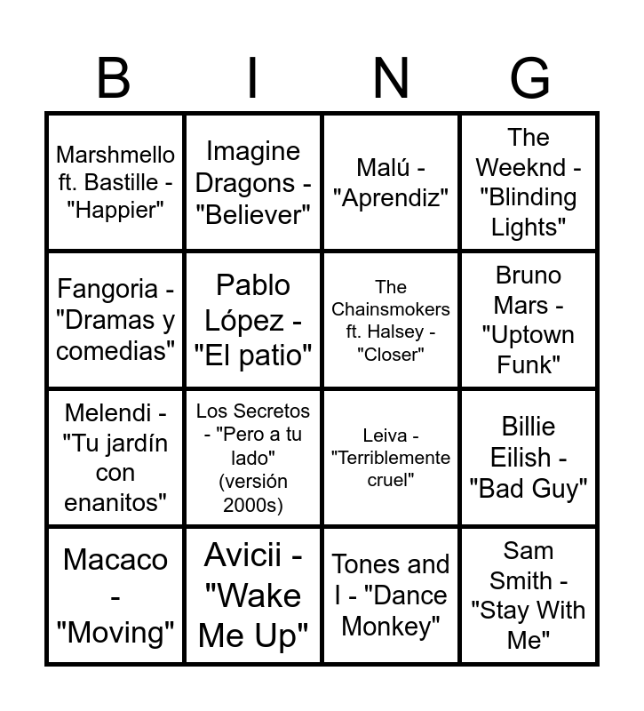 This bingo card has 89 words: Rosalía - "Malamente", Shakira - "Waka Waka", Alejandro Sanz - "Corazón partío", Enrique Iglesias - "Bailando", La Oreja de Van Gogh - "El último vals", David Bisbal - "Ave María", Adele - "Hello", Luis Fonsi ft. Daddy Yankee - "Despacito", Pablo Alborán - "Solamente tú", Ed Sheeran - "Shape of You", Coldplay - "Viva la Vida", Amaral - "Cómo hablar", El Canto del Loco - "Besos", Beyoncé - "Single Ladies", Manu Chao - "Me gustas tú", Bruno Mars - "Uptown Funk", Juanes - "La camisa negra", Lady Gaga - "Bad Romance", Vetusta Morla - "Copenhague", Rihanna ft. Calvin Harris - "We Found Love", Estopa - "La raja de tu falda", Dua Lipa - "New Rules", Mecano - "Una rosa es una rosa", Justin Bieber - "Sorry", Melendi - "Tu jardín con enanitos", Katy Perry - "Firework", Serrat & Sabina - "Y sin embargo", Taylor Swift - "Shake It Off", Héroes del Silencio - "Entre dos tierras", Pharrell Williams - "Happy", Malú - "Aprendiz", Billie Eilish - "Bad Guy", Dani Martín - "Cero", Imagine Dragons - "Believer", Rosario - "Qué bonito", The Weeknd - "Blinding Lights", Fangoria - "Dramas y comedias", Adele - "Rolling in the Deep", Leiva - "Terriblemente cruel", Sam Smith - "Stay With Me", Macaco - "Moving", Ariana Grande - "Thank U, Next", Fito y Fitipaldis - "Por la boca vive el pez", Maroon 5 - "Sugar", Antonio Orozco - "Devuélveme la vida", Avicii - "Wake Me Up", Lorde - "Royals", Luz Casal - "No me importa nada", Daft Punk ft. Pharrell Williams - "Get Lucky", Pablo López - "El patio", Ellie Goulding - "Love Me Like You Do", Raphael - "Mi gran noche" (Versión 2010s), Sia - "Chandelier", La Pegatina - "Y se fue", Drake - "One Dance", Amaral - "Moriría por vos", Calvin Harris ft. Rihanna - "This Is What You Came For", Niña Pastori - "Cuando nadie me ve", Ed Sheeran - "Thinking Out Loud", Chambao - "Pokito a poko", Shawn Mendes - "Stitches", Beret - "Lo siento", Post Malone - "Circles", Alaska y Dinarama - "Ni tú ni nadie" (remix 2000s), Camila Cabello ft. Young Thug - "Havana", Manolo García - "Pájaros de barro", Harry Styles - "Watermelon Sugar", Joaquín Sabina - "19 días y 500 noches" (en directo 2000s), Cardi B - "I Like It", Izal - "La mujer de verde", Tones and I - "Dance Monkey", Carlos Baute - "Colgando en tus manos", Bruno Mars - "Locked Out of Heaven", Los Secretos - "Pero a tu lado" (versión 2000s), The Chainsmokers ft. Halsey - "Closer", Estrella Morente - "Volver", Snoop Dogg & Wiz Khalifa ft. Bruno Mars - "Young, Wild & Free", Maldita Nerea - "El secreto de las tortugas", The Black Eyed Peas - "I Gotta Feeling", Melendi - "Cheque al portamor", Marshmello ft. Bastille - "Happier", Celtas Cortos - "20 de abril" (versión 2010s), Jennifer Lopez ft. Pitbull - "On The Floor", Rosana - "A fuego lento" (remix), Kings of Leon - "Use Somebody", Nino Bravo - "Libre" (versión 2000s), Miley Cyrus - "Wrecking Ball", Rosendo - "Agradecido" and Luis Fonsi ft. Demi Lovato - "Échame la culpa".