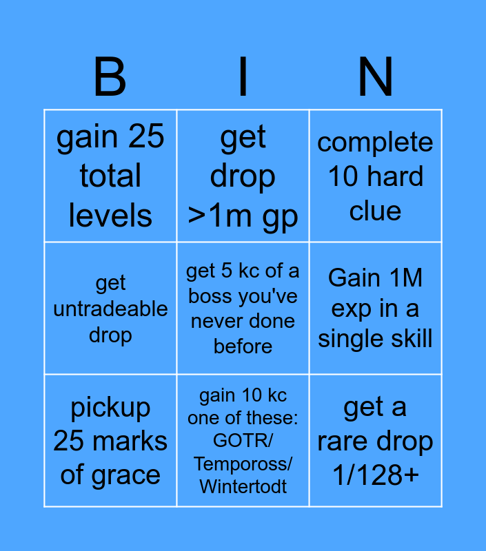 This bingo card has a free space and 8 words: Gain 1M exp in a single skill, complete 10 hard clue, get drop >1m gp, pickup 25 marks of grace, gain 25 total levels, get a rare drop 1/128+, get untradeable drop and gain 10 kc one of these: GOTR/ Tempoross/ Wintertodt.