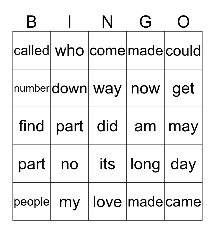 This bingo card has a free space and 24 words: no, my, way, people, could, called, number, who, am, its, now, find, long, day, down, made, may, come, get, part, came, part, made and love.