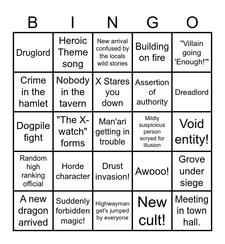 This bingo card has 25 words: Horde character, Highwayman get's jumped by everyone, X Stares you down, A new dragon arrived, "Villain going 'Enough!'", Druglord, Crime in the hamlet, Heroic Theme song, Mildly suspicious person scryed for illusion, Drust invasion!, Assertion of authority, Dogpile fight, Awooo!, Grove under siege, Nobody in the tavern, Meeting in town hall., Void entity!, New arrival confused by the locals wild stories, Dreadlord, "The X-watch" forms, Man'ari getting in trouble, Suddenly forbidden magic!, Random high ranking official, Building on fire and New cult!.