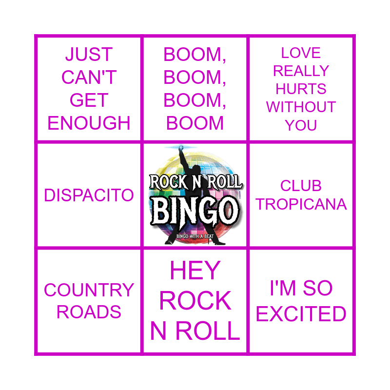 This bingo card has a free space and 50 words: 5 6 7 8, 9 TO 5, ALWAYS LOOK ON THE BRIGHT SIDE OF LIFE, BABY SHARK, BARBIE GIRL, BLAME IT ON THE BOOGIE, BOOM, BOOM, BOOM, BOOM, CELEBRATION, CLUB TROPICANA, COME ON EILEEN, COUNTRY ROADS, DISPACITO, FOOTLOOSE, GANGNAM STYLE, GREASED LIGHTNIN', HEY BABY, HEY ROCK N ROLL, HOT HOT HOT, I'M GONNA BE 500 MILES, I'M SO EXCITED, IS THIS THE WAY TO AMARILLO, IT'S RAINING MEN, JUST CAN'T GET ENOUGH, LILY THE PINK, LIP UP FATTY, LIVIN' LA VIDA LOCA, LIVIN' ON A PRAYER, LIVING NEXT DOOR TO ALICE, LOVE REALLY HURTS WITHOUT YOU, MACARENA, MAMBO NO.5, MIRROR MAN, REACH, REET PETITE, ROCK AROUND THE CLOCK, ROCKIN' ALL OVER THE WORLD, SATURDAY NIGHT, SHUT UP & DANCE, SOME GIRLS, STAYIN' ALIVE, SWEET CAROLINE, THE LOCOMOTION, THE TIMEWARP, THOSE WERE THE DAYS, TWIST & SHOUT, WATERLOO, WE WILL ROCK YOU, WIG WAM BAM, WONDERWALL and Y.M.C.A..