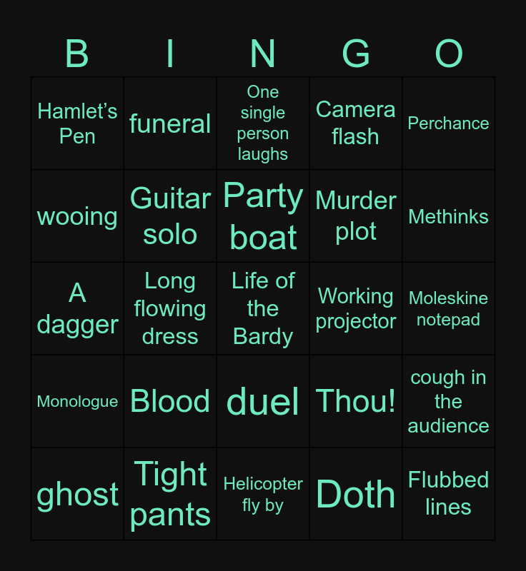 This bingo card has 25 words: Blood, Helicopter fly by, Party boat, ghost, Perchance, Hamlet’s Pen, wooing, funeral, Working projector, duel, Murder plot, A dagger, Thou!, cough in the audience, Guitar solo, Flubbed lines, Moleskine notepad, One single person laughs, Methinks, Long flowing dress, Life of the Bardy, Tight pants, Monologue, Camera flash and Doth.