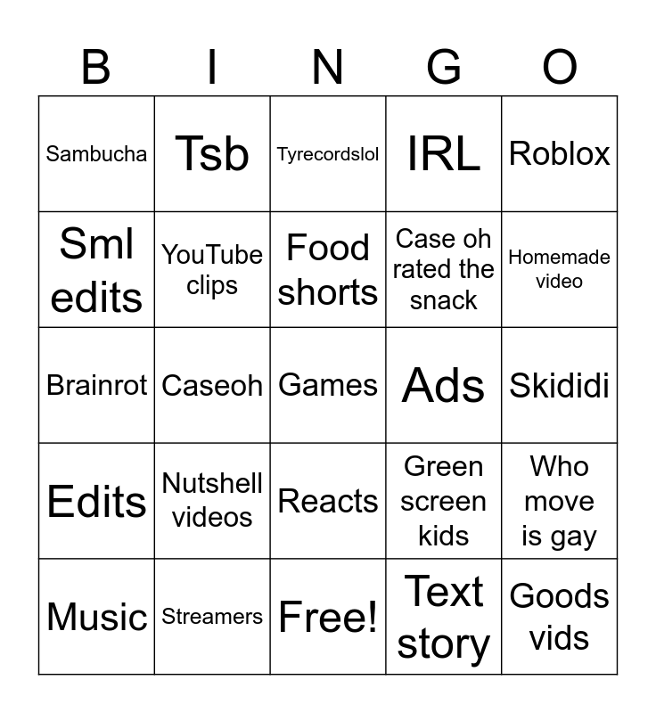 This bingo card has 25 words: Edits, Streamers, Games, Text story, Roblox, Sambucha, Tsb, Tyrecordslol, Ads, Who move is gay, Sml edits, YouTube clips, Free!, Green screen kids, Homemade video, Music, Caseoh, Food shorts, Case oh rated the snack, Skididi, Brainrot, Nutshell videos, Reacts, IRL and Goods vids.