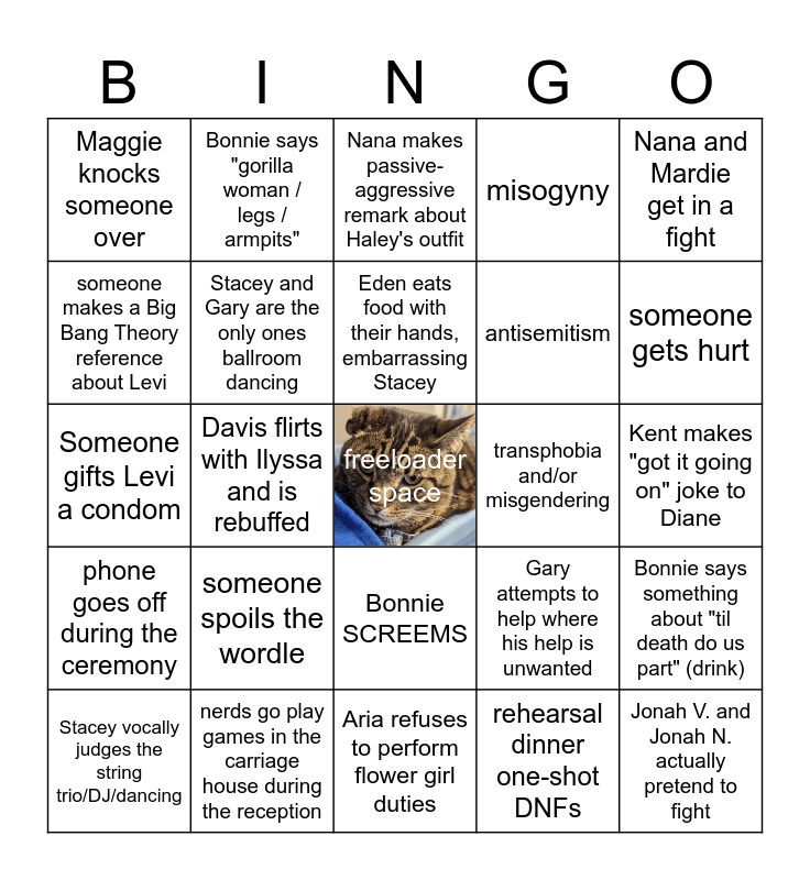 This bingo card has a free space and 24 words: someone spoils the wordle, nerds go play games in the carriage house during the reception, Eden eats food with their hands, embarrassing Stacey, Stacey vocally judges the string trio/DJ/dancing, Nana and Mardie get in a fight, Maggie knocks someone over, someone makes a Big Bang Theory reference about Levi, Bonnie says "gorilla woman / legs / armpits", transphobia and/or misgendering, Bonnie SCREEMS, antisemitism, Someone gifts Levi a condom, Gary attempts to help where his help is unwanted, Bonnie says something about "til death do us part" (drink), Stacey and Gary are the only ones ballroom dancing, rehearsal dinner one-shot DNFs, Kent makes "got it going on" joke to Diane, Nana makes passive-aggressive remark about Haley's outfit, someone gets hurt, Davis flirts with Ilyssa and is rebuffed, Jonah V. and Jonah N. actually pretend to fight, phone goes off during the ceremony, misogyny and Aria refuses to perform flower girl duties.