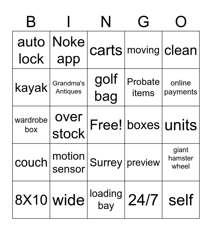 This bingo card has a free space and 44 words: Nation wide, self, Storage, 8X10, no keys, 24/7, carts, elevator, clean, wide, moving, boxes, Surrey, motion sensor, security camera, loading bay, bubble wrap, wardrobe box, tape, online payments, Noke app, climate control, Sharable entry, auto lock, 800, units, wide door, free shaw wifi, preview, couch, king size bed, giant hamster wheel, business files, wine storage, over stock, winter tires, holiday items, amazon gifts, golf bag, kayak, Probate items, reserve unit, Grandma's Antiques and Non profit donations.