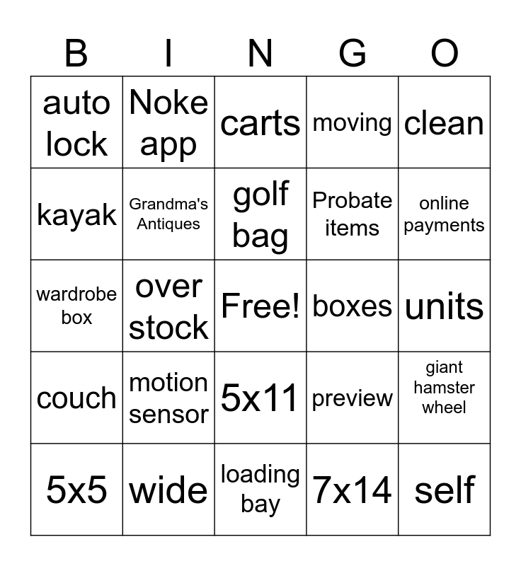 This bingo card has a free space and 44 words: Nation wide, self, Storage, 5x5, no keys, 7x14, carts, elevator, clean, wide, moving, boxes, 5x11, motion sensor, security camera, loading bay, bubble wrap, wardrobe box, tape, online payments, Noke app, climate control, Sharable entry, auto lock, 800, units, wide door, free shaw wifi, preview, couch, king size bed, giant hamster wheel, business files, wine storage, over stock, winter tires, holiday items, amazon gifts, golf bag, kayak, Probate items, reserve unit, Grandma's Antiques and Non profit donations.