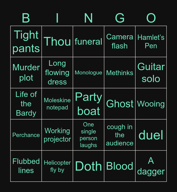 This bingo card has 25 words: Perchance, Helicopter fly by, Party boat, Blood, Hamlet’s Pen, Tight pants, Thou, funeral, Ghost, duel, Murder plot, Long flowing dress, Doth, cough in the audience, Guitar solo, Flubbed lines, Moleskine notepad, Monologue, Methinks, Wooing, Life of the Bardy, Working projector, One single person laughs, Camera flash and A dagger.