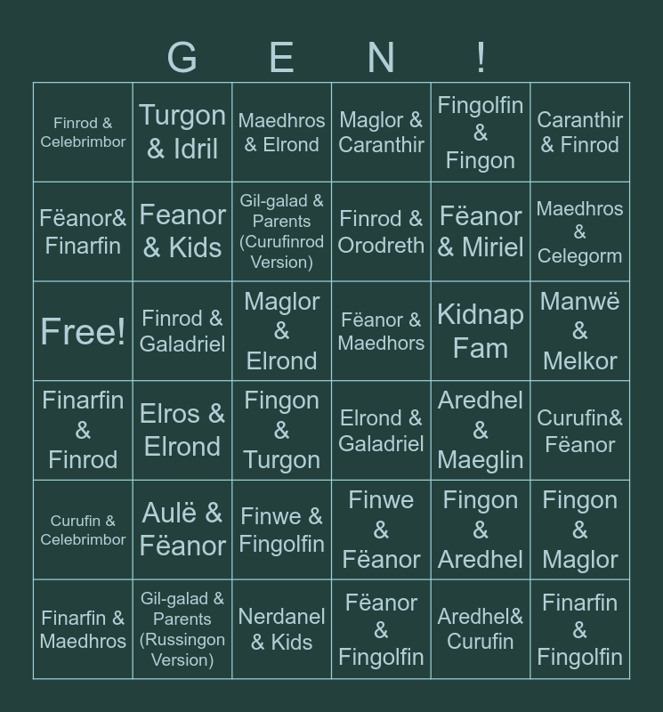 This bingo card has 36 words: Finwe & Fëanor, Finwe & Fingolfin, Fëanor & Fingolfin, Fëanor& Finarfin, Finarfin & Finrod, Fëanor & Maedhors, Feanor & Kids, Nerdanel & Kids, Fingolfin & Fingon, Fingon & Aredhel, Maedhros & Celegorm, Maglor & Caranthir, Fingon & Maglor, Finrod & Galadriel, Finrod & Orodreth, Finrod & Celebrimbor, Curufin & Celebrimbor, Kidnap Fam, Free!, Maedhros & Elrond, Maglor & Elrond, Elros & Elrond, Elrond & Galadriel, Fingon & Turgon, Aredhel & Maeglin, Turgon & Idril, Fëanor & Miriel, Gil-galad & Parents (Russingon Version), Gil-galad & Parents (Curufinrod Version), Caranthir & Finrod, Finarfin & Fingolfin, Finarfin & Maedhros, Curufin& Fëanor, Manwë & Melkor, Aulë & Fëanor and Aredhel& Curufin.
