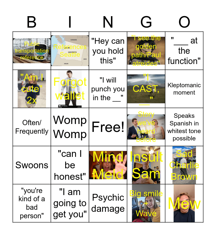 This bingo card has 12 images, a free space and 24 words: "can I be honest", "I am going to get you", "I will punch you in the __", "you're kind of a bad person", "___ at the function", Public transportation reference, "Am I cute" 2x, References Seattle, Story we've heard before, Mind Meld, "I CAST, __", Often/ Frequently, Insult Sam, Sad Charlie Brown, Forgot wallet, Big smile + Wave, Speaks Spanish in whitest tone possible, "Hey can you hold this", Kleptomanic moment, Womp Womp, Mew, Swoons, "I see the golden path/Paul atreides" and Psychic damage.