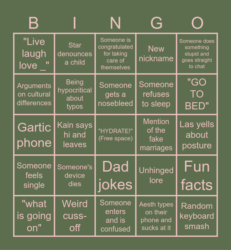 This bingo card has a free space and 24 words: Someone's device dies, Weird cuss-off, Someone gets a nosebleed, "what is going on", Someone does something stupid and goes straight to chat, "Live laugh love _", Arguments on cultural differences, Star denounces a child, Mention of the fake marriages, Dad jokes, Someone refuses to sleep, Gartic phone, Unhinged lore, Fun facts, Being hypocritical about typos, Aesth types on their phone and sucks at it, Las yells about posture, Someone is congratulated for taking care of themselves, "GO TO BED", Kain says hi and leaves, Random keyboard smash, Someone feels single, New nickname and Someone enters and is confused.