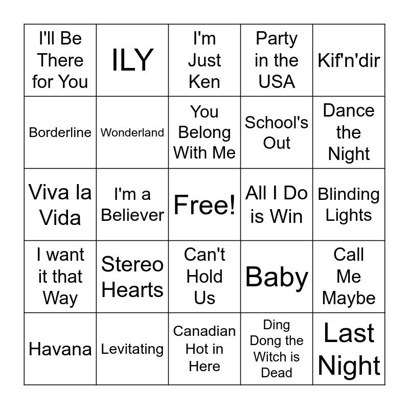 This bingo card has a free space and 50 words: In the Stars, Last Night, Stronger Beer, Canadian Hot in Here, Stereo Hearts, Brazil, ILY, Brooklyn in the Summer, Borderline, Notion, Wonderland, Party in the USA, Call Me Maybe, Baby, Love Story, But Daddy I Love Him, You Belong With Me, All I Do is Win, Thunder, Kif'n'dir, I'm a Believer, Ding Dong the Witch is Dead, I'll Be There for You, School's Out, Case depart, Vivir Mi Vida, Dance the Night, Barbie World, I'm Just Ken, Can't Hold Us, Coffee Shop Bop, Kill Bill, Annihilate, As it Was, Levitating, YMCA, Uptown Funk, Bad Habits, Hey Jude, Blinding Lights, Sorry, Never Gonna Give You Up, Roar, Happy, Havana, Viva la Vida, Yellow, Stayin' Alive, I want it that Way and Dance Monkey.